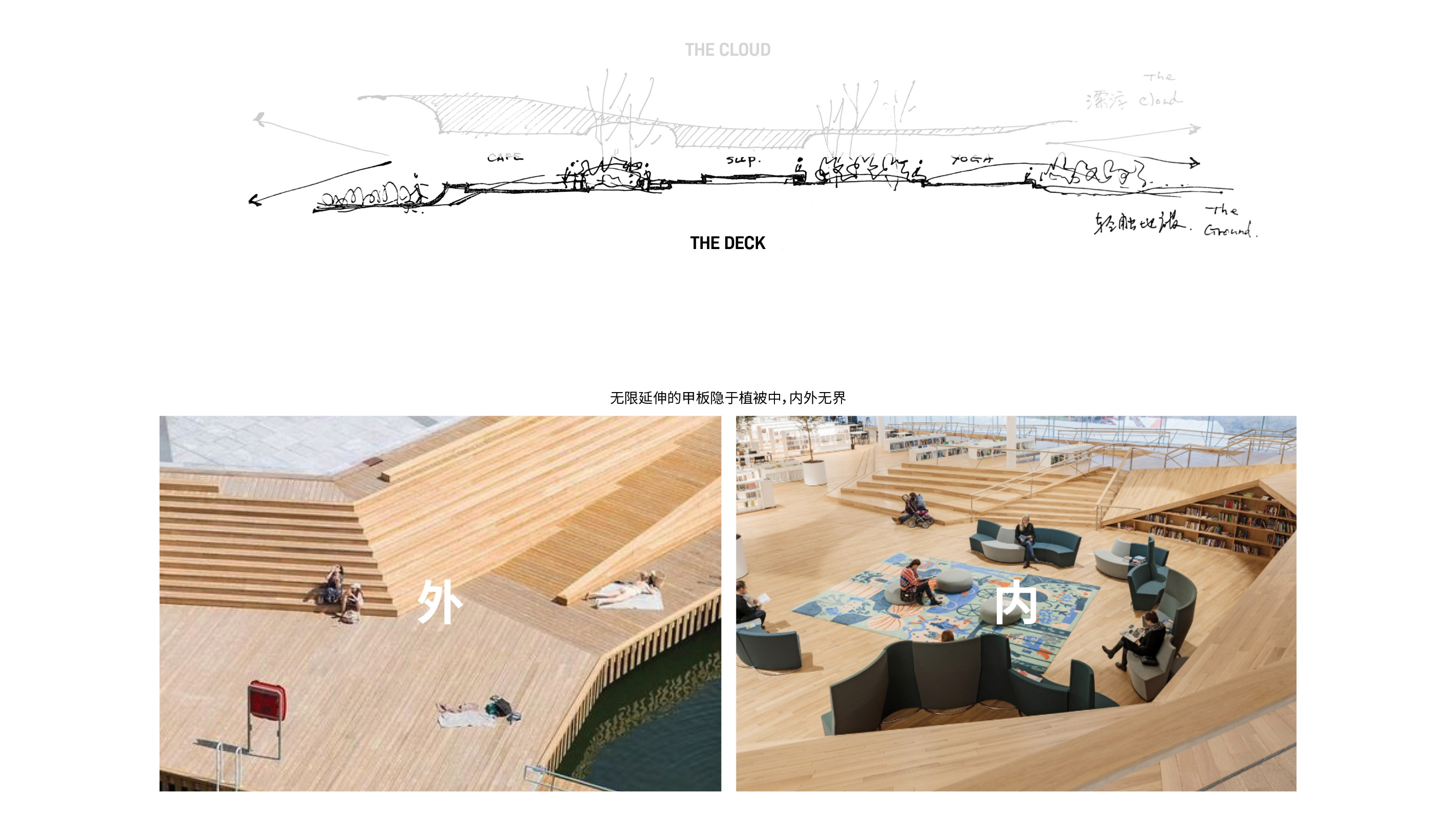 屋顶之下空间划分为两个区域:一侧容纳运动功能区,含咖啡馆与更衣室;另一侧暂时用作住宅展厅,未来将转化为有顶盖的公共广场。