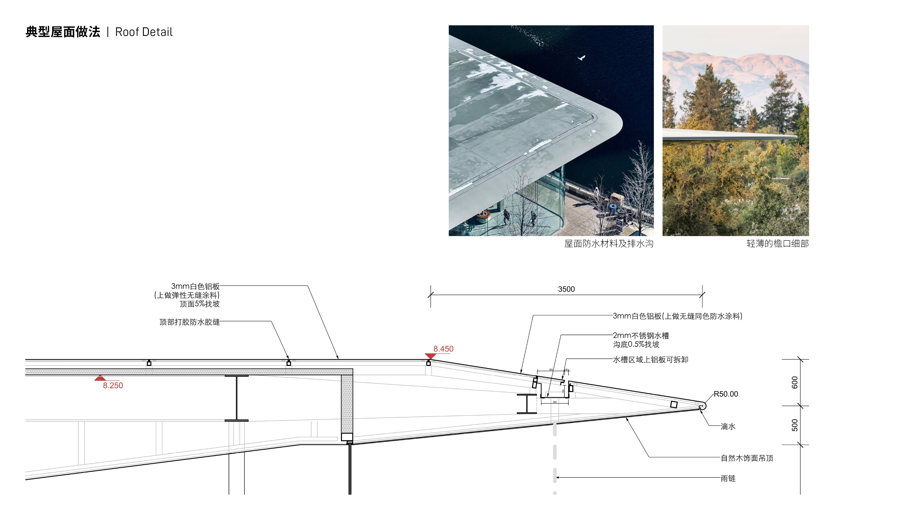 我们设计了极致纤薄的屋顶边缘,以营造轻盈悬浮的视觉感受。屋顶表面呈现为纯粹的白色抽象形态,其下方则铺设线性排列的木板饰面,强化流动的几何形态。