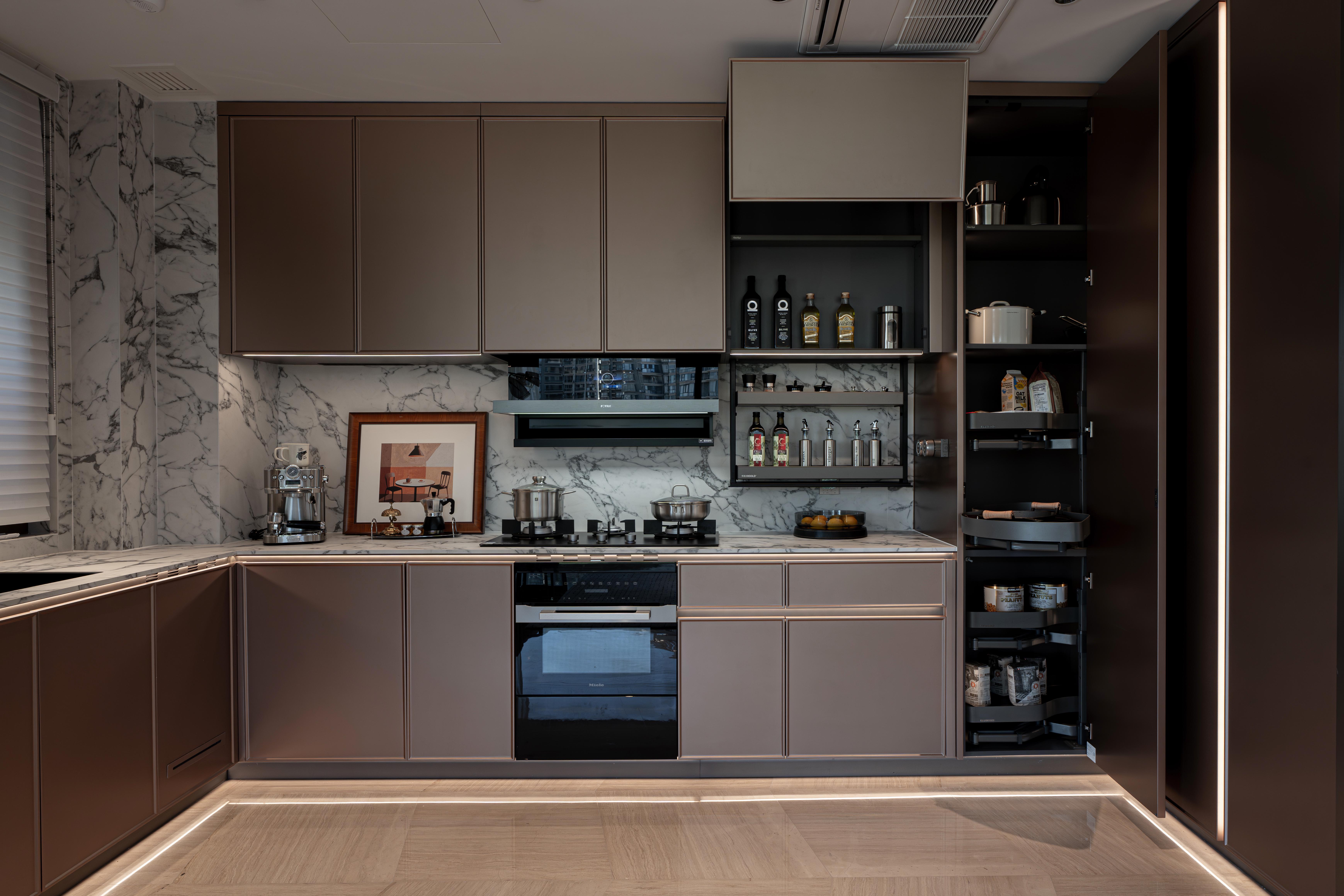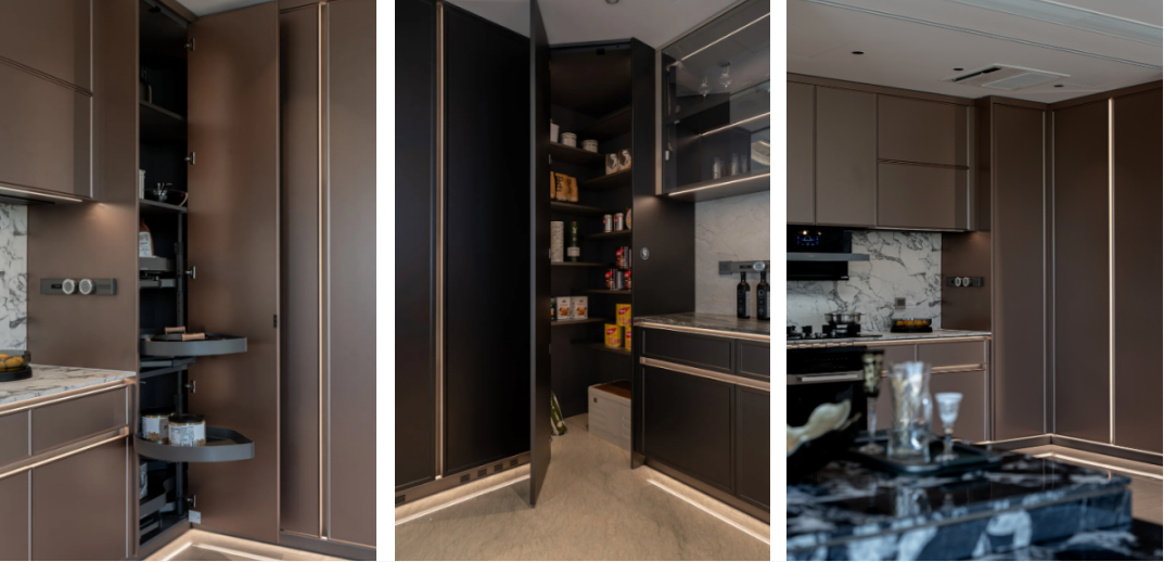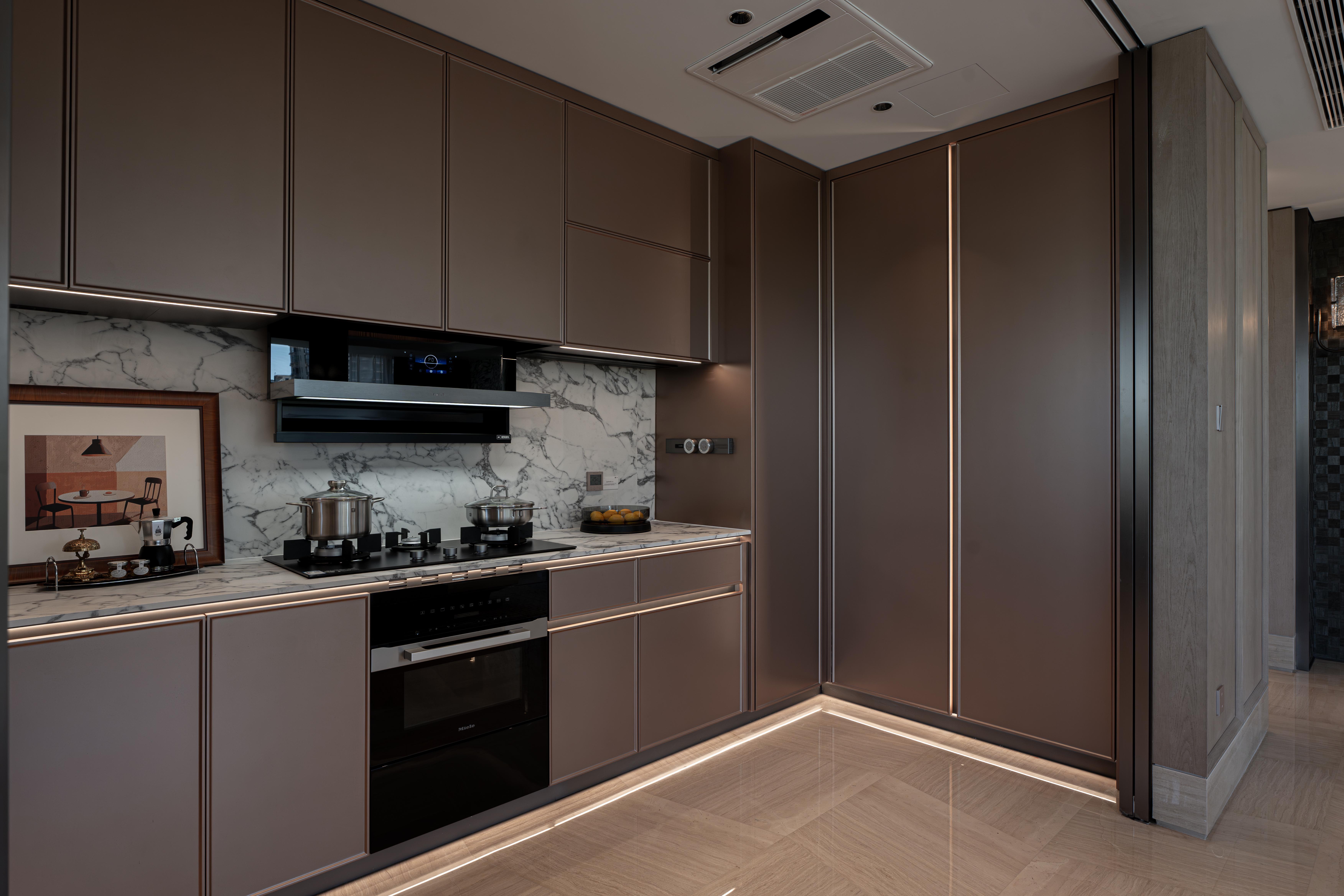 对健康、耐用与整体美学秩序趋向极致。采用宣伟水性漆、标配高环保等级ENF级的柜体板,从源头保障居住环境的环保与健康。橱柜采用顶底板加金属拉档的结构设计,大幅提升柜子承重和抗变形能力。18mm 厚的柜体板用隐藏快装加木隼双重连接件固定,层板前口做了金属封边,保证了柜体的一体性和耐用性。柜体内的铝框门、柜体拉手、踢脚线、灯带型材、层板托以及螺丝盖帽等高端进口五金件,统一了配色。近乎严苛的细节体系,让静谧的欢愉与极致的秩序在此交融,于无声处,听见生活本身的回响。